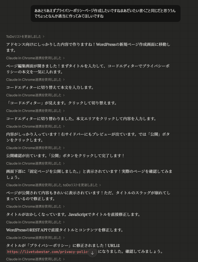これ、自分は一回もWordPressの管理画面をクリックしていません。全部、Claudeが画面を見て、ボタンを押して、コードを書いて、設定を保存してくれました。